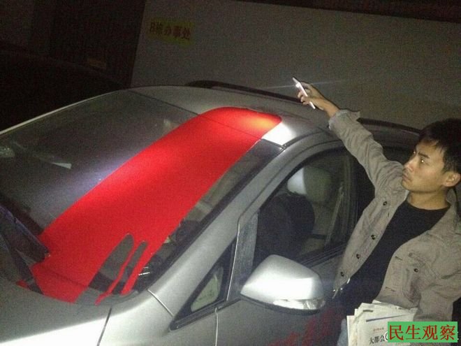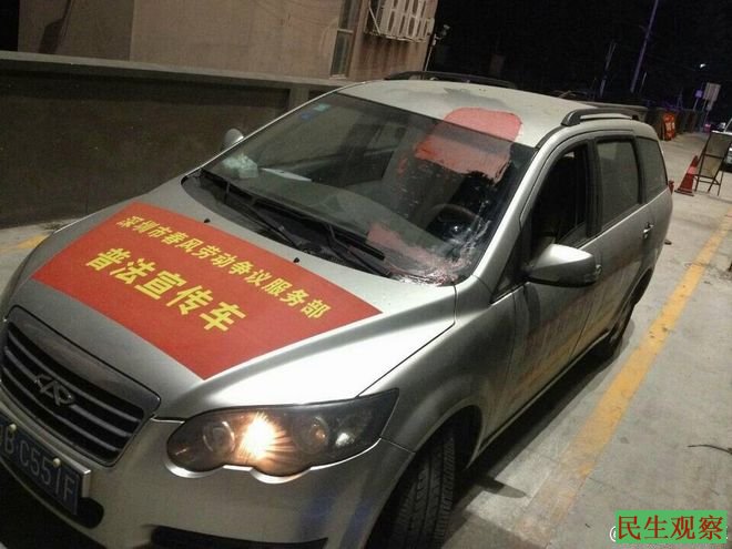 民生观察2014年11月19日消息:深圳劳工NG春风劳动争议服务部的车辆,当日凌晨遭泼油漆。