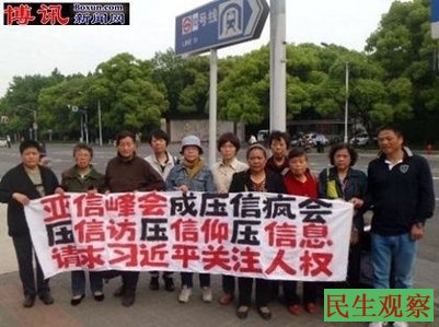 2014年5月12日、13日亚信峰会前夕,上海十多位访民在西郊宾馆等地方拉起横幅,“亚信峰会成压信疯会,压信访、压信仰、压信息,请求习近平关注人权”等横幅内容,遭到牢狱之灾。
