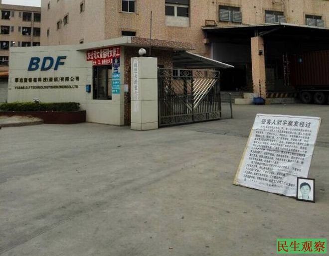 民生观察2014年12月15日消息:不幸遇难的工友叫刘宇,是湖北省通城县人,31岁,2014年9月16日入职深圳华志宝德福有限公司。家人今年11月9日开始发现联系不上她,手机关机,她姐姐和她老公跟厂方交涉,厂方不理睬,认定她是自离。警方通过宿舍和工厂的监控视频,发现刘宇11月9日进厂上班后就没有出厂。厂方在11月19号发现遗体在厂里的一个废料仓库。法医验尸后,尸体被悄悄带走。公安至今没有破案。