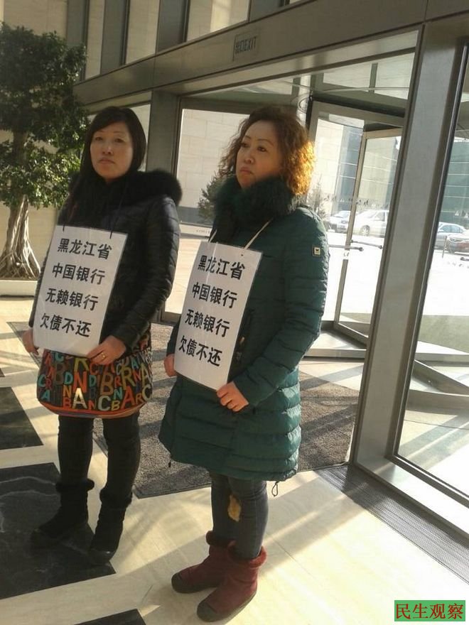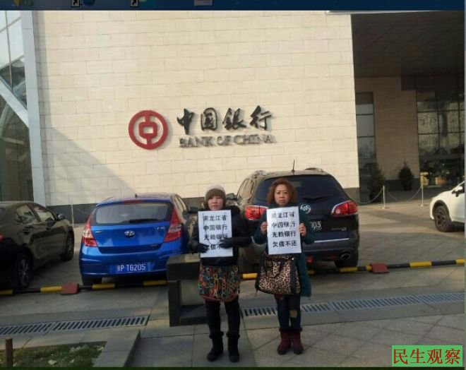 北京四大银行维权断友(被买断下岗)继续在北京各总行总部讨要说法,今天中行有两位女断友在西单路口中国银行总行门口挂牌维权,他们是黑龙江中国银行的,牌子上写着着“黑龙江省 中国银行 无赖银行 欠债不还 讨要公道”等字样。