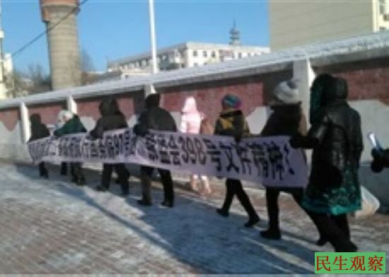 民生观察工作室2015/1/20日消息:昨天早上8:30分,工、农、建、中四大银行黑龙江省支行再加信用社,五家金融机构被买断工龄的职工50余人一起到省政府维权,他们打起了“我们要生活,我们要工作,我们要吃饭”及“强烈要求黑龙江省政府执行国务院97号涵,银监会398号文件精神”等横幅, 省政府推却责任踢皮球把他们一起推到了省银监会,最后又推回银行。