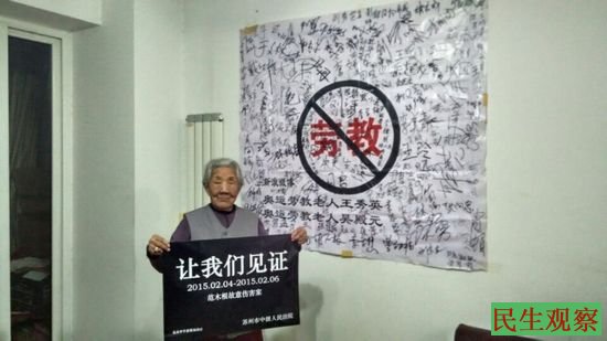 图为:“奥运劳教老人”王秀英举牌声援范木根
