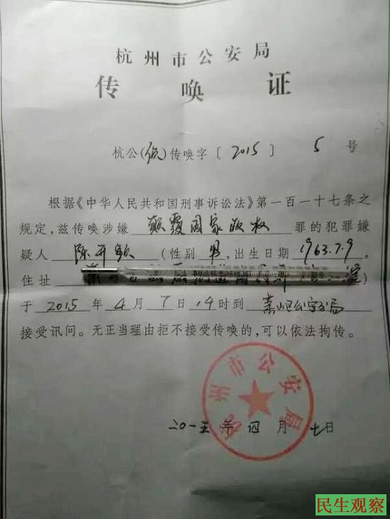 民生观察工作室2015-4-8消息:据杭州民主人士邹巍发来消息,昨天,浙江省公安厅国保人员专门来到萧山,对民主党成员陈开频进行刑事传唤,涉嫌罪名是“颠覆国家政权”。