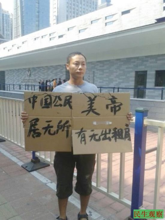 上图为:刘四仿在美国驻广州领事馆门前举牌