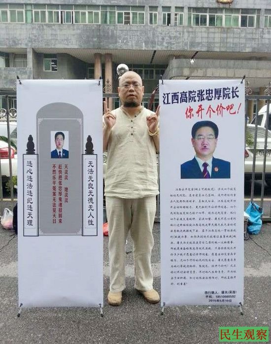 民生观察工作室2015-5-19消息:今天上午,资深维权人士“屠夫”(本名:吴淦),因在江西高院门前举牌维权被江西警方抓走。