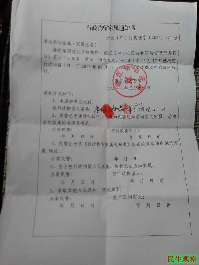 民生观察工作室2015/5/20消息:潘向荣、黄行之是湖北省潜江市工商银行的二位买断下岗职工,多来来一直在上访维权。近日,潘向荣、黄行之又来到了北京上访。5月16日,二人从天安门广场出站,经过马家楼时,被查出身上带有上访文件,遂交送民警,后又被赶到北京的潜江市广华派出所王峰 、潜江市工商银行副行长付明、潜江市工商银行员工谢楠泽等人强行带走 ,送到一辆黑车上押回潜江。当时车上有五名黑保安 ,不许二人说话,并对她们进行人身攻击,17日晚,二人被送押至湖北省潜江拘留所,18日签发行政拘留10日通知书。