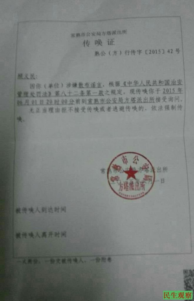 民生观察工作室2015-6-1消息:本工作室刚刚从江苏常熟异议人士顾义民的妻子处获悉,在下午17时许,顾义民被常熟警方从家中带走。此次常熟警方给顾义民开具了传唤证,说是顾义民前不久在常熟街头给民众发放传单,讲述黑龙江庆安火车站被警察“击毙”公民徐纯合的案情,涉嫌造谣。
