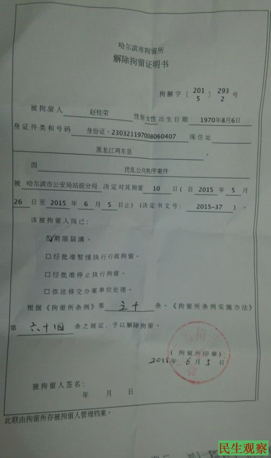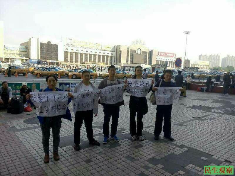 民生观察工作室2015/6/6消息:5月24日,哈尔滨赵桂荣、沈阳许梅英和林明洁、大连姜建军、湖北恩施王申红几名来自全国各地的维权人在哈尔滨站前广场等地打手写标语,揭露央视等有关部门关于徐纯合案造假,要求还原事实真相,结果于5月25日被哈尔滨治安分局以“散发传单““扰乱公共秩序”为由抓捕,五人均被拘留十天。今天赵桂荣等拘留期满已获得释放,王申红被湖北当地公安带回了湖北。