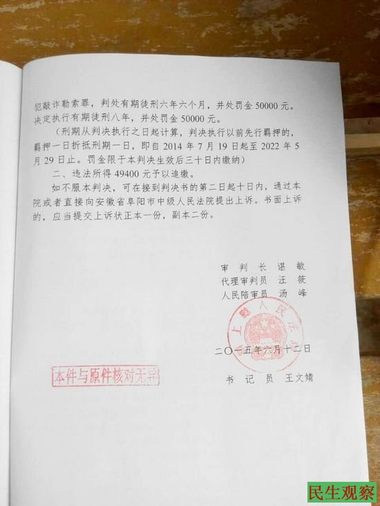 民生观察工作室2015/7/1消息:安徽省颍上县江店孜镇农科村访民杨士侠,6月12日被颍上县人民法院以寻衅滋事罪判处其有期徒刑2年6个月,犯敲诈勒索罪判处有期徒刑6年6个月,合并执行有期徒刑8年,并处罚金5万元,违法所得49400元予以追缴,现关押于阜阳市看守所,日前杨士侠已提起上诉。