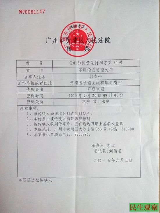 郭春平不服广州黄埔区公安分局治安管理处罚一案,随即将该局起诉到法院,现广州黄埔区法院决定将于7月20日上午9点在该院第十法庭开庭审理。