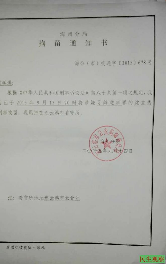 民生观察工作室2015/9/15消息:本网前天发布了江苏连云港访民沈立秀被抓走后“失踪”的消息(江苏连云港访民沈立秀被警方抓走后失联http://www.aaa.aetdhfjgk.cf/a/lanmu1/2015/0913/13119.html)。今天,河南访民聂丽娜发来消息证实,沈立秀已被刑事拘留了。