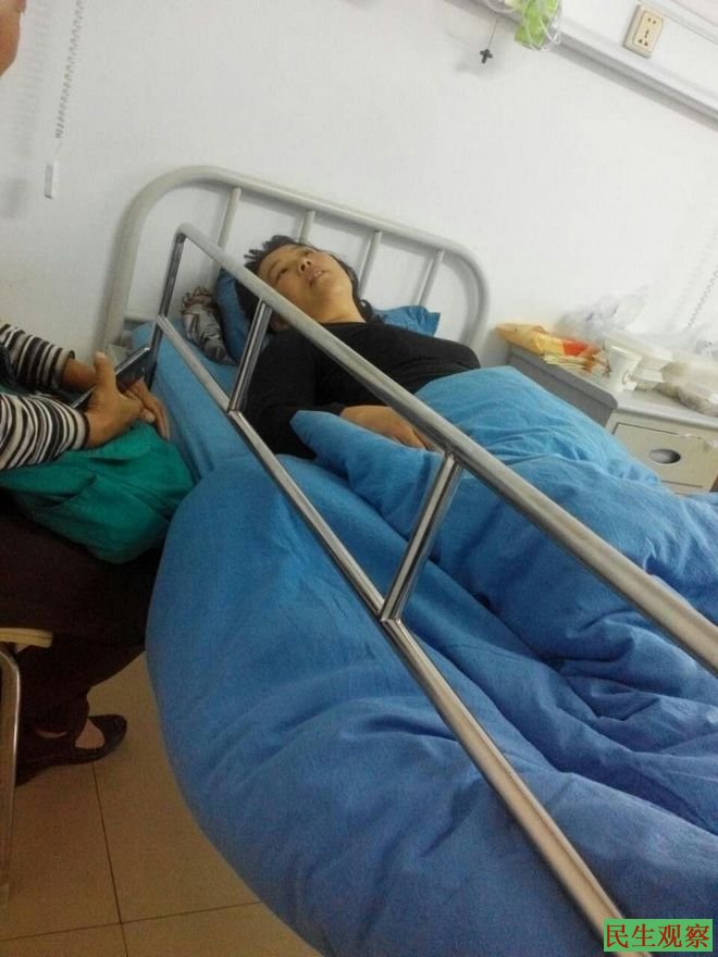 王娟目前身体虚弱,说话有气无力的!两条腿肿的可粗了,全青了,王娟说她被抓走后长阳镇政府什么手段都给她用了,现在还在逼她在拆迁证上签字!当初抓走她的人也是镇政府雇的。现在他们让王娟吃的就是烙饼、咸菜。