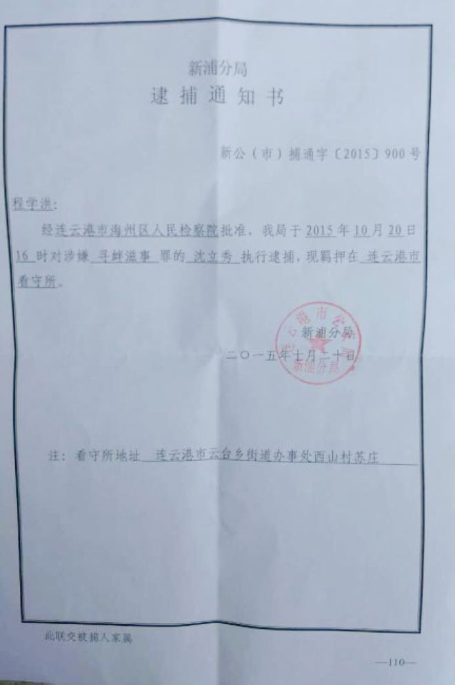 沈立秀是 2015年9月13日在亲属家中被10几名警察抓走,当日被海州公安分局刑拘,当时警方透露是因为沈立秀在外网上的照片涉嫌违法,这之前沈立秀也因为在外网上的照片被刑拘过,还曾因上访被拘留、劳教。