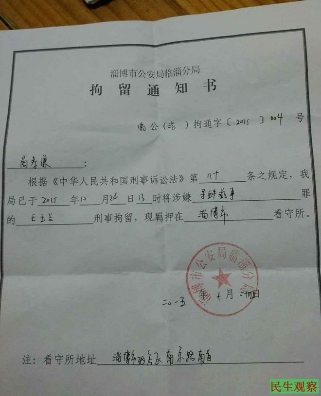 10月15日临淄区齐陵街道办淄河村维权人士胡海玲在家中被临淄公安局强行带走,第二天被刑事拘留。