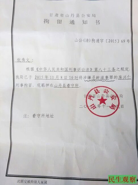 张秀文则认为:房兴仁反映的事,地方政府不管他才到北京上访的,山丹县公安局就因为他到天安门、中南海、国家信访局、中纪委、中央军委、民政部这些地方上访多次而拘留他,这次还发展到刑事拘留。