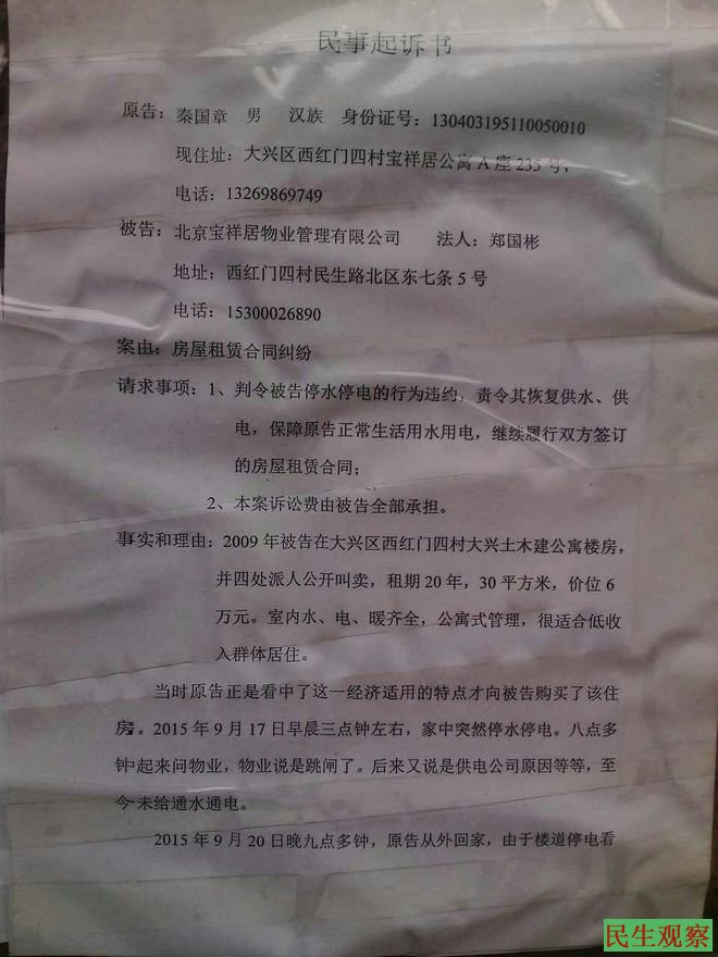 北京的十月天气就开始慢慢变冷了,宝祥居居民a座235秦国章律师在家开始升起了煤炉子!同时秦律师也在为断水断电问题起诉物业,在2015年11月10日秦律师接到北京市大兴区人民法院民事传票,12月1日在红星人民法庭第二法庭开庭。