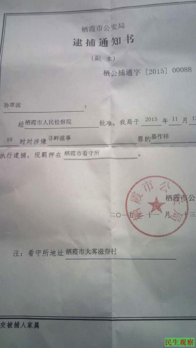 山东烟台栖霞市慕作祥被以“寻衅滋事罪” 批捕
