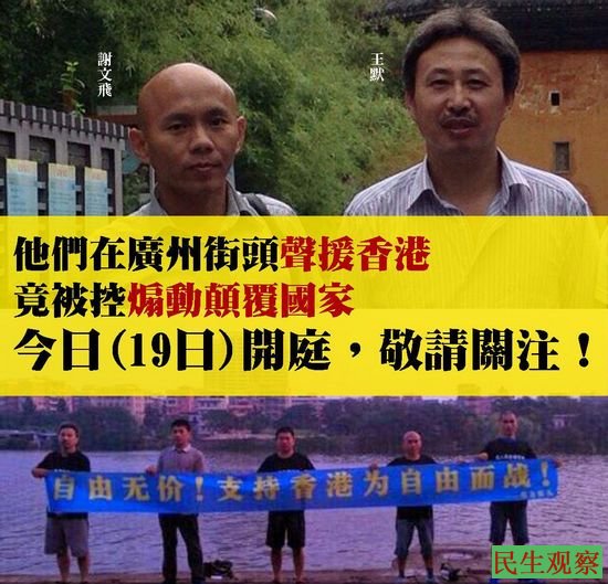 民生观察工作室2015/11/19日消息:今日上午九点,南方街头运动行动者谢文飞,王默被指”煽动颠覆国家政权罪“一案在广州中院第十四法庭开庭,从外地赶来旁听的山东苏士芹、湖南衡阳胡双庆、福建孙涛被庭外警察带走,先关押于广州越秀山体育场,又转到广场派出所。