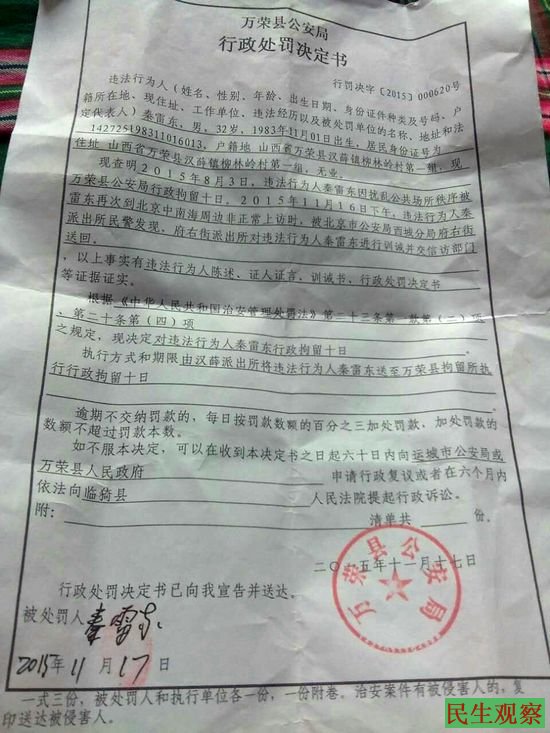 民生观察工作室2016/1/1消息:山西万荣县访民秦雷东,11月17日到中南海上访,万荣县公安局认为其扰乱公共秩序,把他送到万荣县拘留所行政拘留10天。