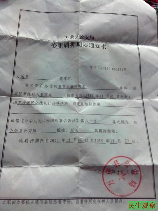 11月27日行政拘留期满,万荣县公安局没有释放他,而是直接以敲诈勒索罪转为刑事拘留,送到万荣县看守所关押。12月4日,万荣县公安局又以秦雷东涉嫌扰乱社会秩序,系结伙作案为由变更了羁押期限,从12月4日起到12月27日止。今天,被以涉嫌敲诈勒索罪被取保释放。