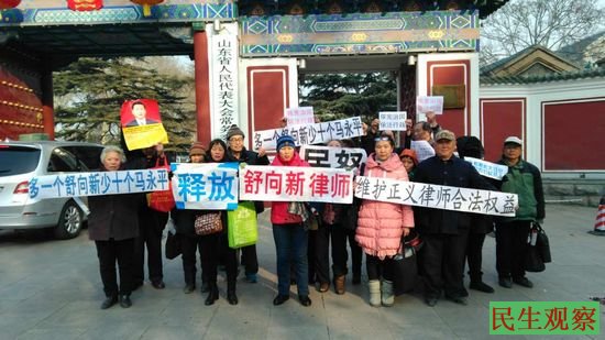 而在今日庭审中,大量公民、记者、律师自发来到法院外抗议司法不公的审判,也有公民前往山东前往山东省人民代表大会常委会抗议,他们打出了“多一个舒向新少十个马永平”“为何正义律师合法权益”“反司法公权滥用”等等标牌抗议,据现场网友介绍,因现场群情激愤,警察进行推搡等手段维护,最终导致舒律师女儿当场晕倒。