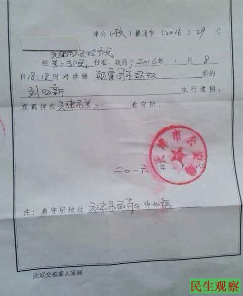 据刘四新家属发出的逮捕证照片显示,刘四新博士于2016年1月8日遭到逮捕,涉嫌罪名“颠覆国家政权罪”,关押在天津市第二看守所。