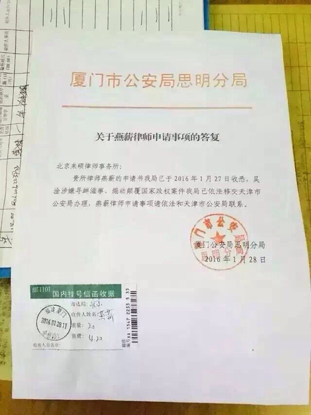 此前,屠夫的代理律师燕薪针对该案有关细节向厦门警方提出申请,今天燕薪律师收到了厦门公安局思明分局的书面答复,该文件显示,屠夫(吴淦)已被移交给天津公安机关,涉嫌罪名为“寻衅滋事”和“煽动颠覆国家政权”,目前尚无法确定关在哪个看守所。
