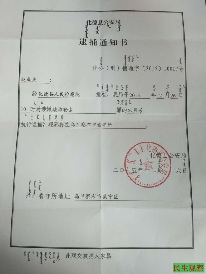 相关报道:内蒙访民宋月芳被以涉嫌敲着勒索罪刑事拘留
