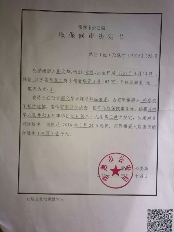 2016年2月24日,苏州常熟市警方在北京市西单公交车站抓捕了邵允黎,随后将其以涉嫌寻衅滋事罪刑拘,羁押于常熟看守所。2016年3月24日警方为其办理了为期一年的取保候审,将其释放回家,但其家门口有人24小时看守,行动受限。