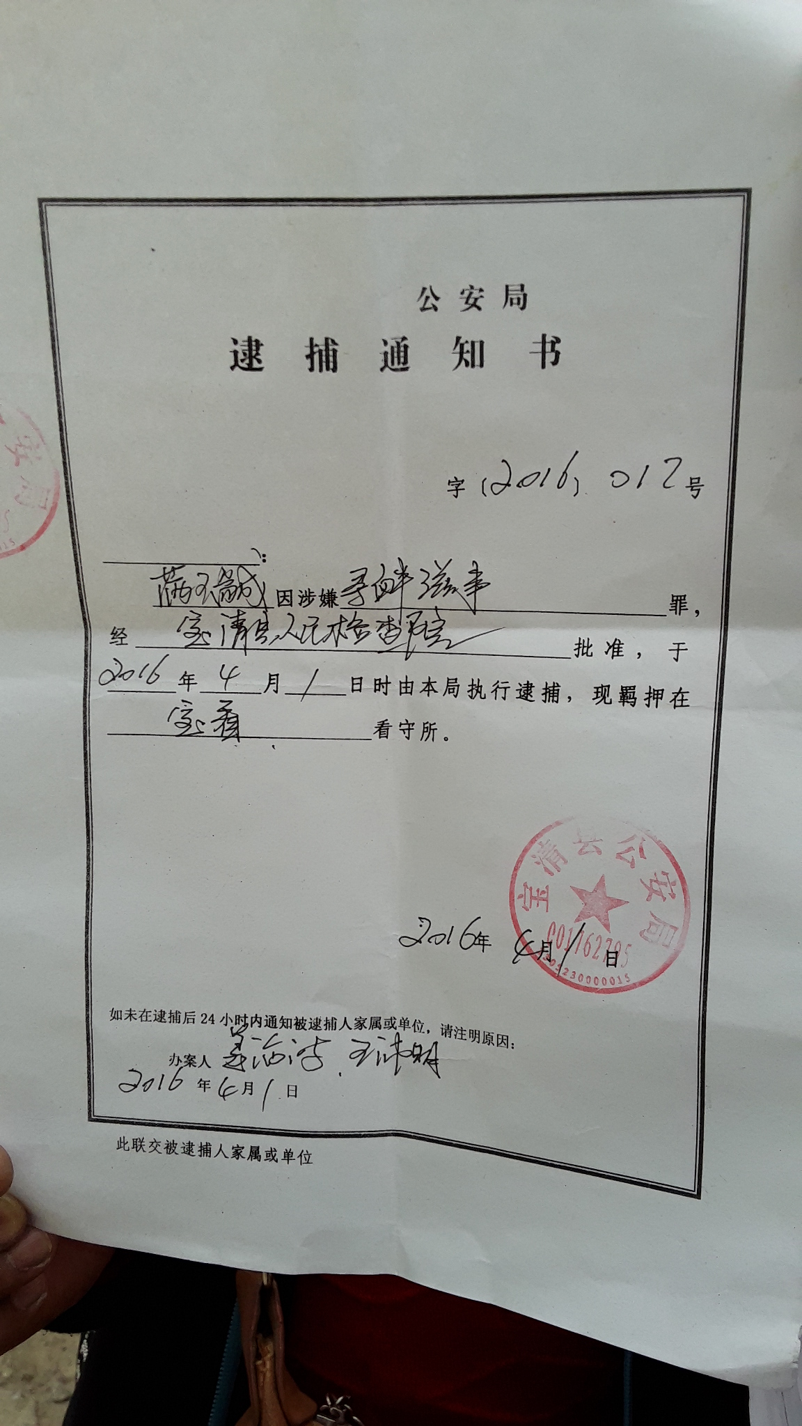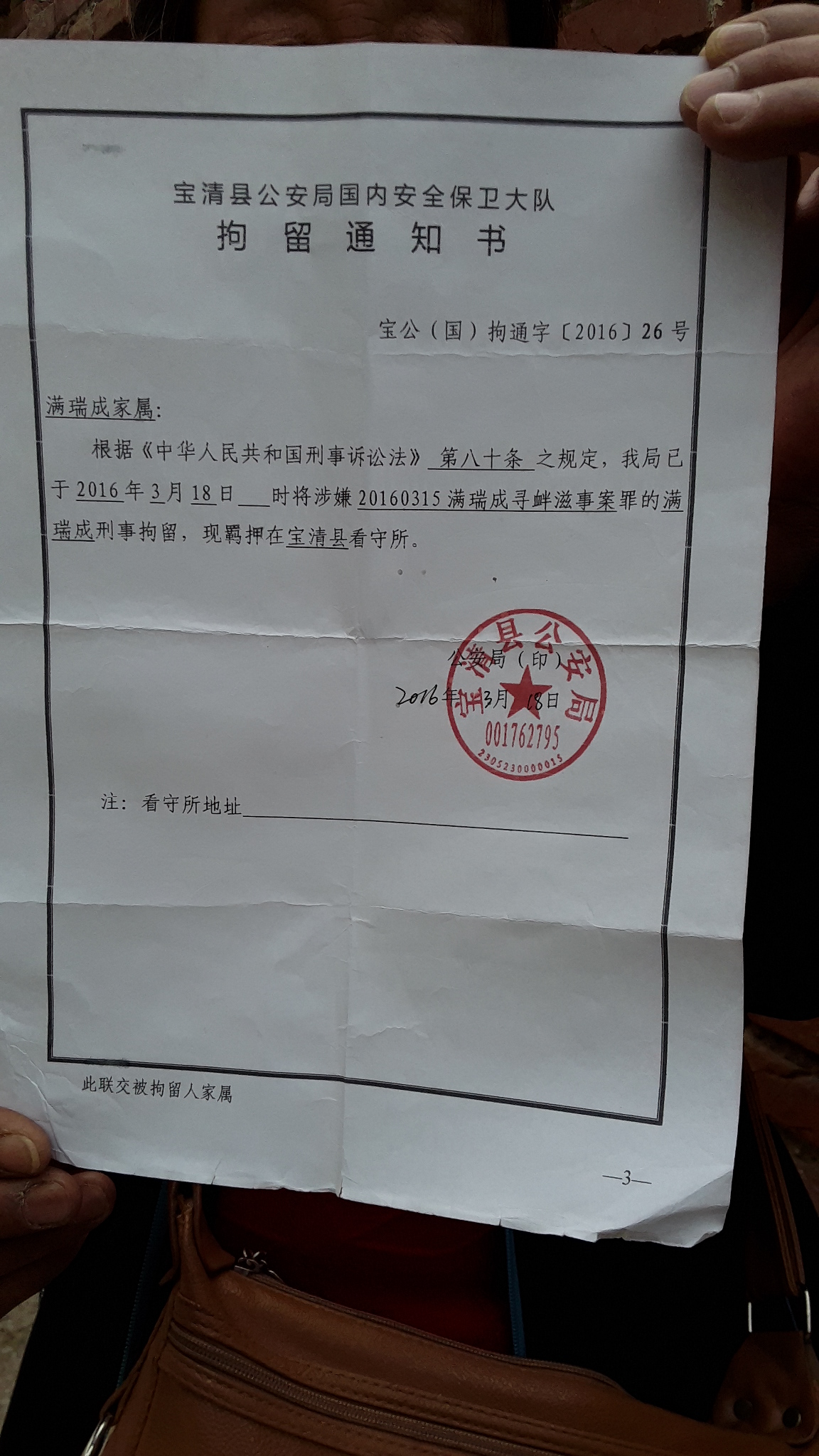 满瑞成妻子冯淑英提供的宝公(国)拘通字【2016】26号拘留通知书中注明,满瑞成是被以寻衅滋事罪刑拘,编号为20160315,现羁押在宝清县看守所。冯淑英说,满瑞成是在家中被镇派出所抓走后刑拘的,她多次索要法律文书公安局才给,同时得知满瑞成是因为上访被抓的。