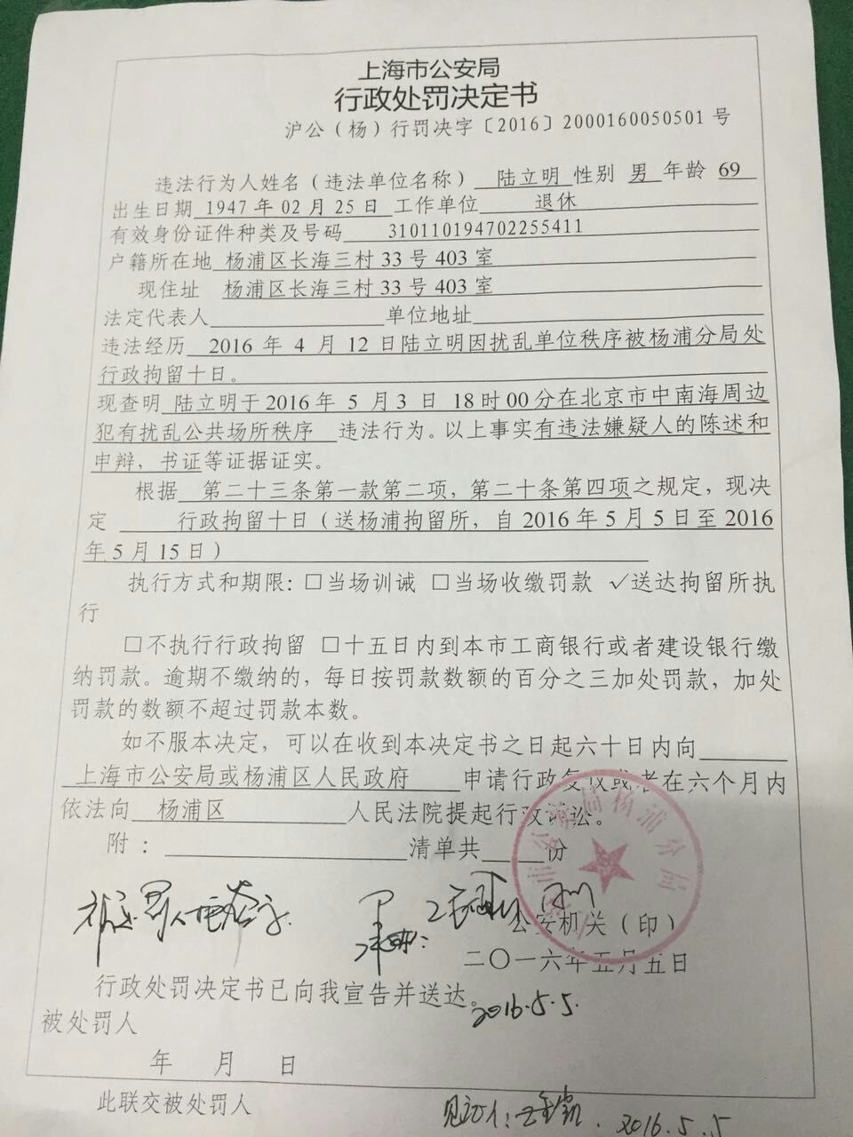 另外,上海杨浦维权人士陆立明5月3日下午前往美使馆、中南海等地区上访,控告上海地方政府非法强迁他家住房十年之久未依法解决他的问题。结果在中南海被北京警方抓获交给上海当局押回,今天上海市公安局决定将其拘留10天。