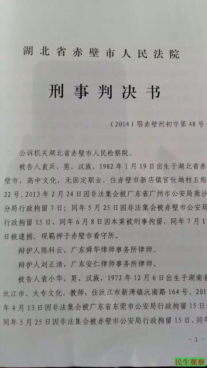 民生观察工作室2016年5月9日消息:赤壁袁小华、袁兵涉嫌寻衅滋事、聚众扰乱公共秩序罪一案今日在赤壁法院宣判,袁小华、袁兵二人均遭重判。
