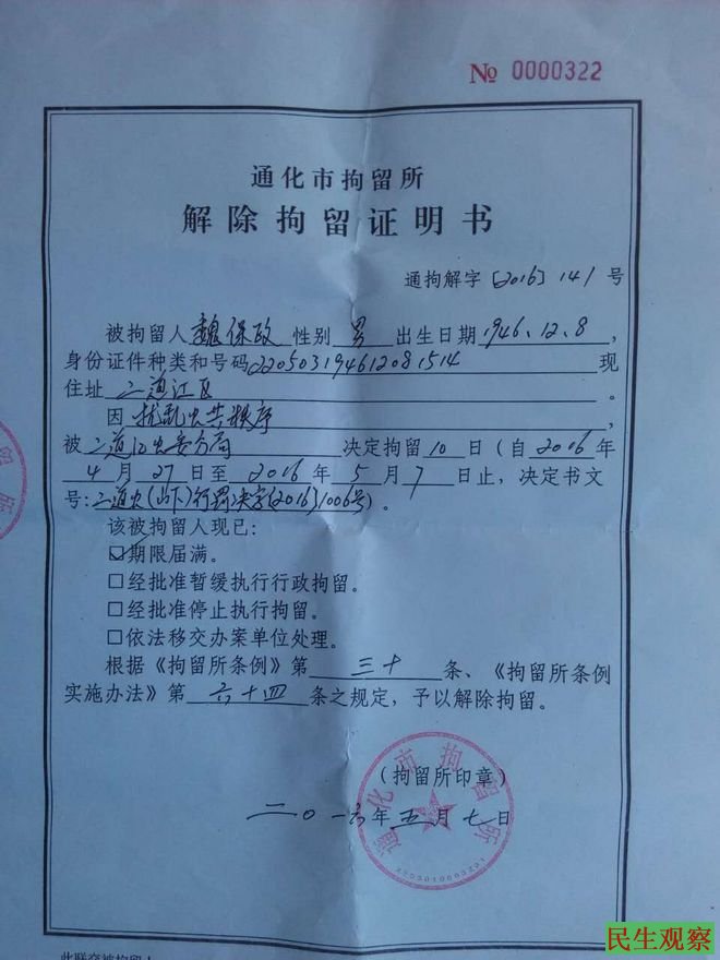 民生观察工作室2016/5/9消息:2016年4月29日,本工作室发布了吉林魏保政、甘肃孙金秀北京上访遭截后均失联(http://www.aaa.aetdhfjgk.cf/a/lanmu1/2016/0429/14317.html )的消息。今天魏保政告诉本作室,4月26日他押回吉林省通化市后,即被行政拘留十日,理由是4月25日他携带写给国家领导人的信乘火车进京上访被劝回。