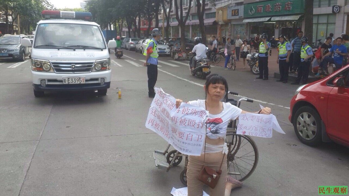 李碧云接受本网志愿者采访时说,6月1日上午约7点半,村里一村民陪伴她去看病,刚离开家不久走到顺德容桂街道的容港路时,就涌现出很多警察和不明身份人员过来,其中当地派出所所长指导员开着警车带了几十个警察和便衣,想强行拖李碧云上车,李碧云马上拿出横幅抗议,被多名警察和便衣围在马路中间。