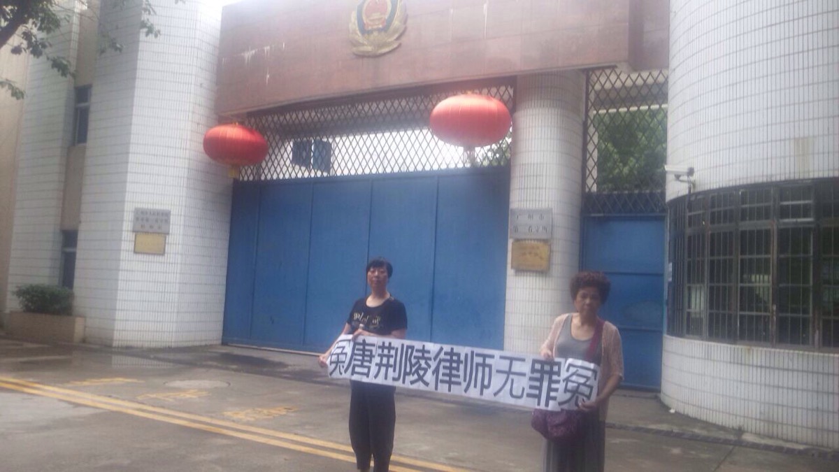 汪艳芳还说,按照法律规定,二审判决后家属就可以申请会见当事人,但是她今天已经第三次前去看守所申请会见当局仍然不允许,对此她难以理解。此外今天广州有网友听说此事后一起到广州一看门口拉条幅声援唐荆陵律师,抗议看守所的违法行为。