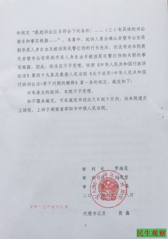 民生观察工作室2016年9月30日消息:朱承志起诉赤壁市公安局警察将其打伤一案被邵阳双清区法院裁定因证据不足不予受理。