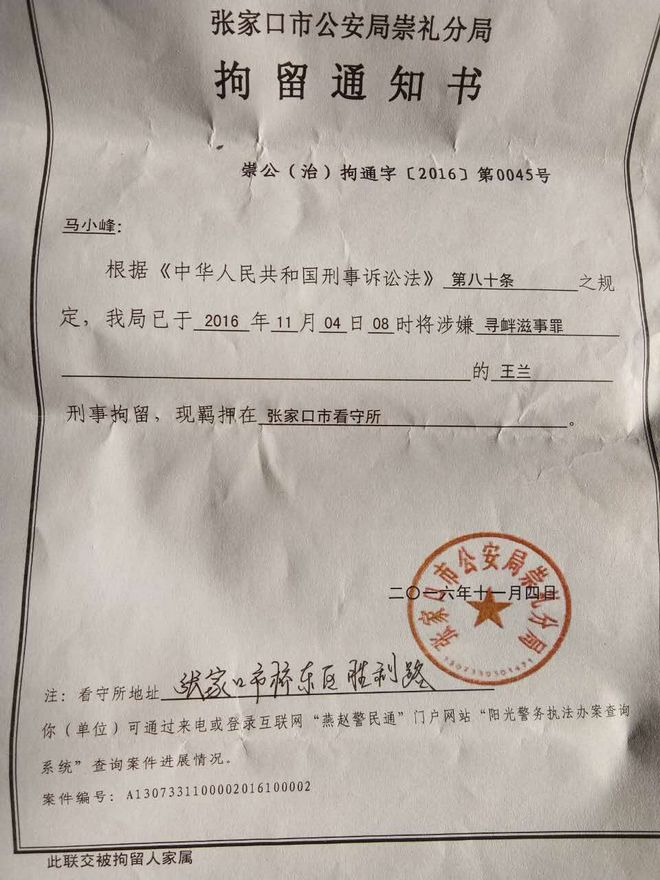 26日王兰在车站买票时又被公安抓获,随即王兰被行政拘留十日。今天王兰拘留期满,我们却收到了她的刑拘通知书,她被以寻衅滋事罪刑事拘留,并送到了张家口市看守所关押。