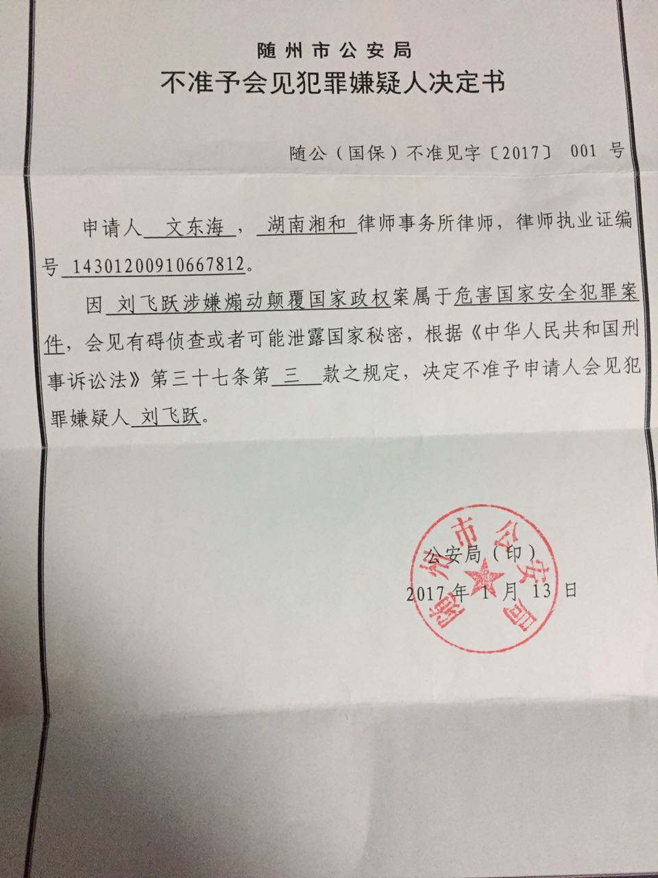 民生观察工作室2017/1/21消息:1月19日,湖南湘和律师事务所文东海律师,前往湖北随州要求会见民生观察创办人刘飞跃再被警方拒绝。昨日文东海律师收到了随州警方邮寄的不准予会见决定书。
