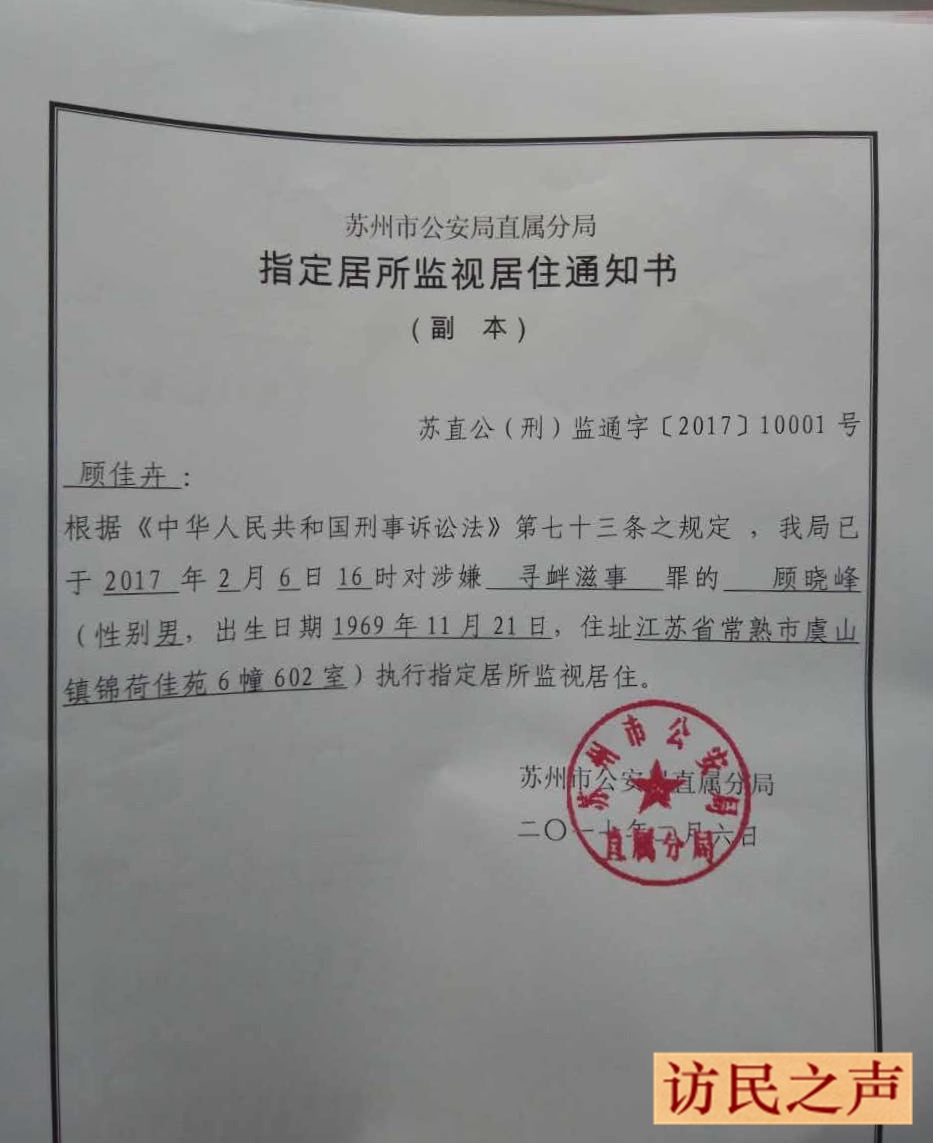 [访民之声2017/2/7消息] 江苏常熟维权人士顾晓峰昨日在工作单位被警方带走并被抄家,今日其家属拿到书面通知,苏州市公安局直属分局以涉嫌寻衅滋事罪将顾晓峰指定居所监视居住。