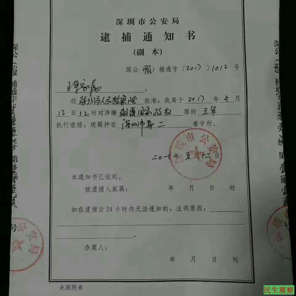 【民生观察工作室2017年5月13日深圳消息】 今日上午,深圳大抓捕之王军的太太严均均发出消息称,收到深圳市公安局寄出的《逮捕通知书》,王军被以“颠覆国家政权罪” 执行逮捕,关押于深圳市第二看守所。