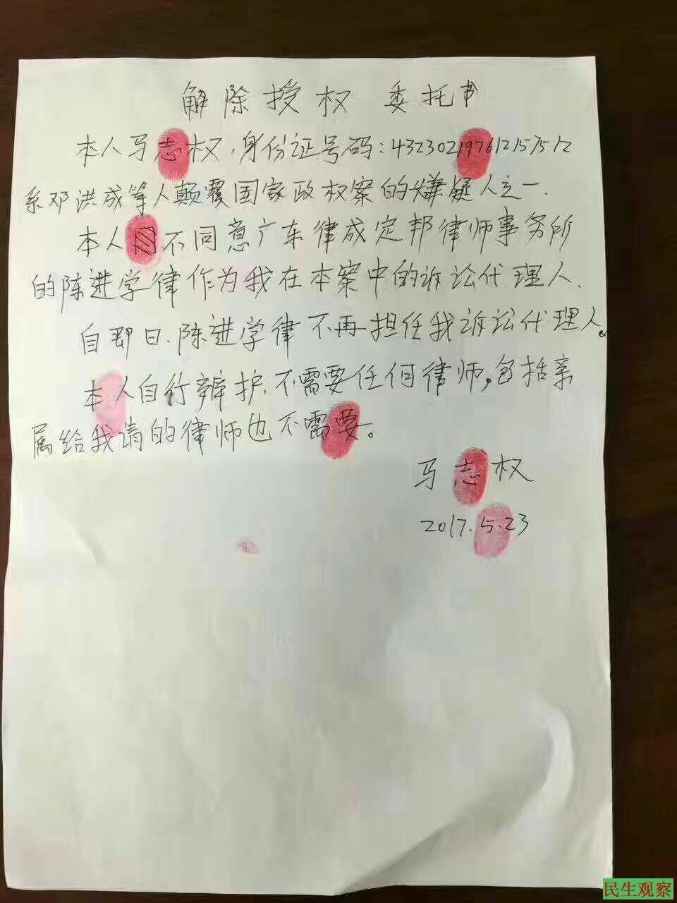 【民生观察工作室2017年5月31日消息】今天,知名人权律师陈进学发出消息称,一天之内收到两份解聘文书。一份是涉嫌“煽动颠覆国家政权罪”案被“指定住所监视居住”已半年的江天勇律师;另外一份是深圳大抓捕事件中涉嫌“颠覆国家政权罪”案的马志权。