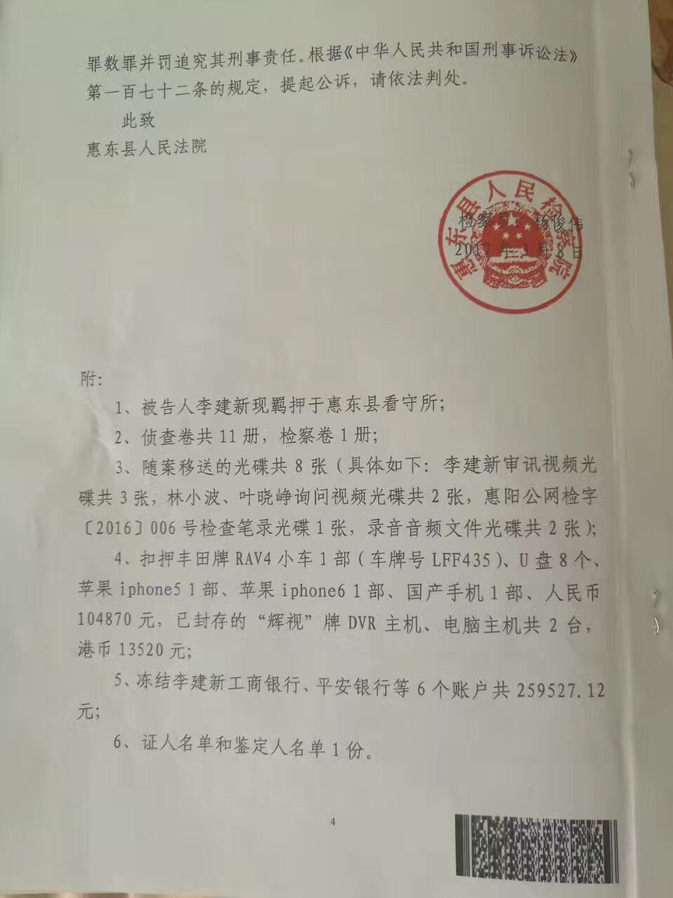 据蔺其磊律师介绍,李健新是广东惠州市惠阳区永湖镇人,1968年出生,网名@惠阳区伯,因实名举报原惠州市副市长黄锦辉而受到网友关注。2016年3月31日,惠州警方以其涉嫌“敲诈勒索”和“非法占用耕田”两罪将其刑拘,该案经过惠州市惠阳区检察院退回补充侦查两次,延长审查起诉期限两次后,于2016年11月24日起诉至惠州市惠阳区法院。惠阳区法院于2017年1月19日发出通知书,告知经惠州市中级法院决定该案由惠东县法院管辖,随后将案件退回到惠阳区检察院,由检察院移送到惠东县检察院再一次审查起诉。惠东县检察院以“惠东检诉刑诉【2017】132号”起诉书于2017年3月8日起诉到惠东县法院,法院定于7月20日上午在该院开庭审理该案。