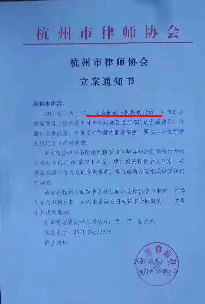 5、浙江吴有水律师仅因网上发表言论,杭州市律协即挥舞大棒,对吴律师立案调查。