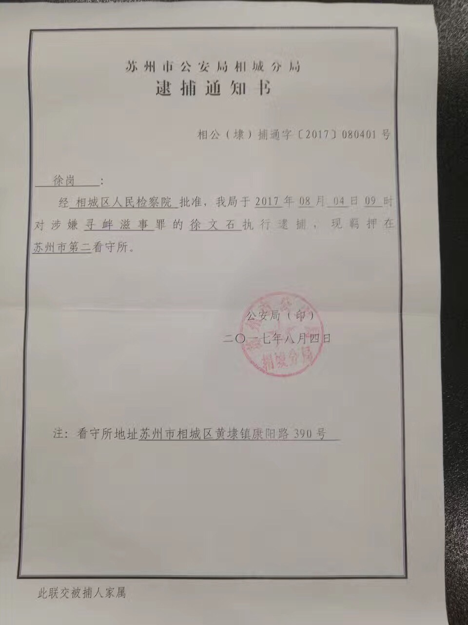 【民生观察2017年8月7日消息】本网从隋牧青律师处获悉,苏州大抓捕之一的常熟维权人士徐文石于8月4日被批准逮捕,家属于今日收到苏州市公安局相城分局寄来的逮捕通知书,涉嫌寻衅滋事罪,羁押于苏州市第二看守所。