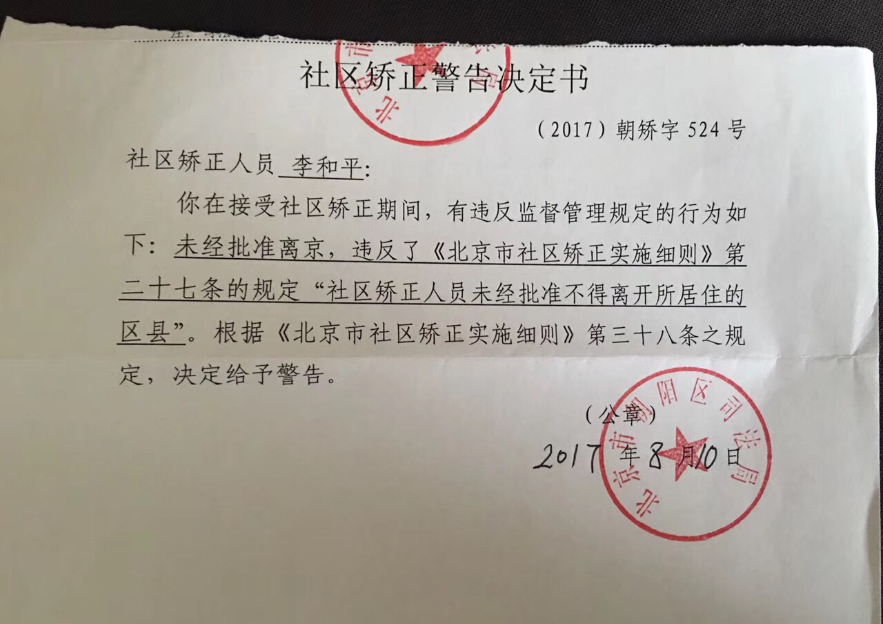 【民生观察2017年8月12日消息】本网从王峭岭处获悉,“709”案被判三年缓刑四年的李和平律师于昨日收到北京市朝阳区司法局发出的“社区矫正警告决定书”,决定书中李和平被称作“社区矫正人员”,声称李和平在接受社区矫正期间擅自离京,违反了《北京市社区矫正实施细则》中的有关规定,决定给予警告。