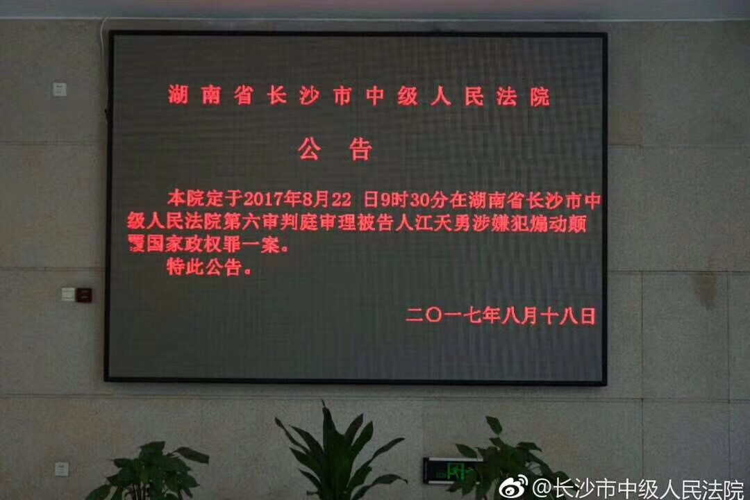【民生观察2017年8月22日消息】今天上午,受到各界关注的江天勇涉嫌“煽动颠覆国家政权罪”一案在位于长沙市曙光中路289号的长沙市中级法院开庭审理。长沙中院官方微博声称对此案审理进行现场直播。