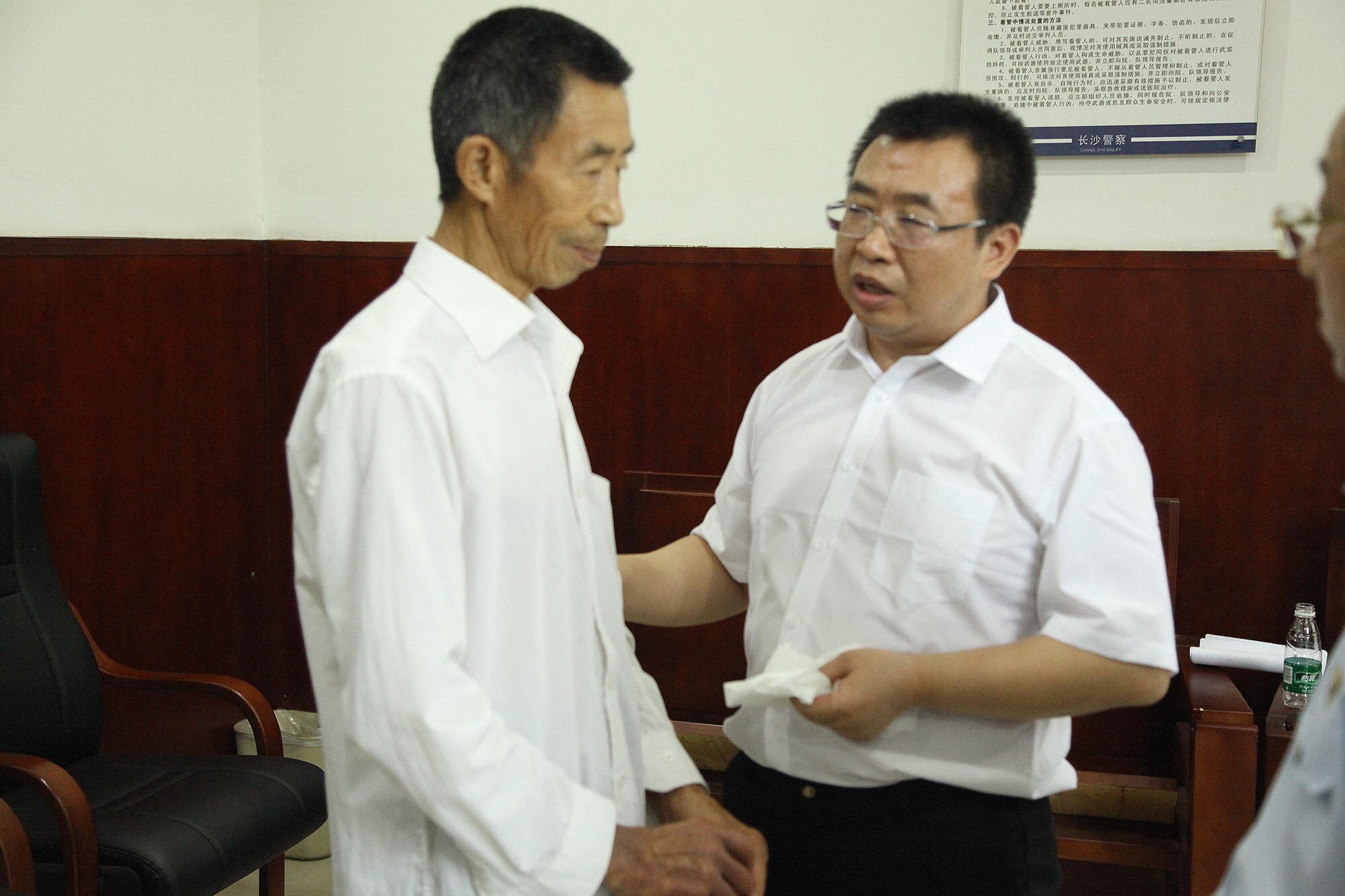 据长沙中院官方微博显示,江天勇父亲被安排进入法院旁听,庭审结束后,江天勇与江父被获准见面,父子有短暂交流。这次开庭直播也让官方一直声称的“江天勇已有辩护律师”的真面目显露人前,两位长沙当地的“官派”律师终于浮出水面,他们是湖南真泽律师事务所的杨杰林和曾杰。