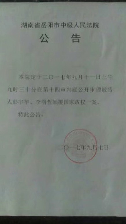 【民生观察2017年9月11日消息】今天上午九点,被强迫失踪177天的台湾籍非政府组织工作者李明哲被大陆指控涉嫌“颠覆国家政权罪”一案在湖南省岳阳市中级法院开庭审理,据法院微博直播的消息显示,李明哲与同案彭宇华均当庭认罪,案件择期宣判。