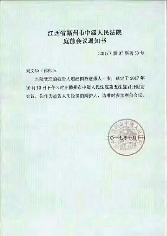 据悉,日前,明经国案辩护人刘文华律师收到江西赣州市中级法院的书面通知,通知称,将于10月13日下午三点钟在赣州市中级法院第五法庭召开庭前会议,请律师准时参与会议。有评论认为,血案发生于3月17日,距今已有七个月时间,事件发生后,当地警方一直以冷处理处置此案,除了强力压制家属的言论和行动外,还设法将介入此案的人权律师劝离,目的就是为了淡化当地政府强拆的事实,而突出明经国的“故意杀人”的“事实”,以震慑其他维权村民。