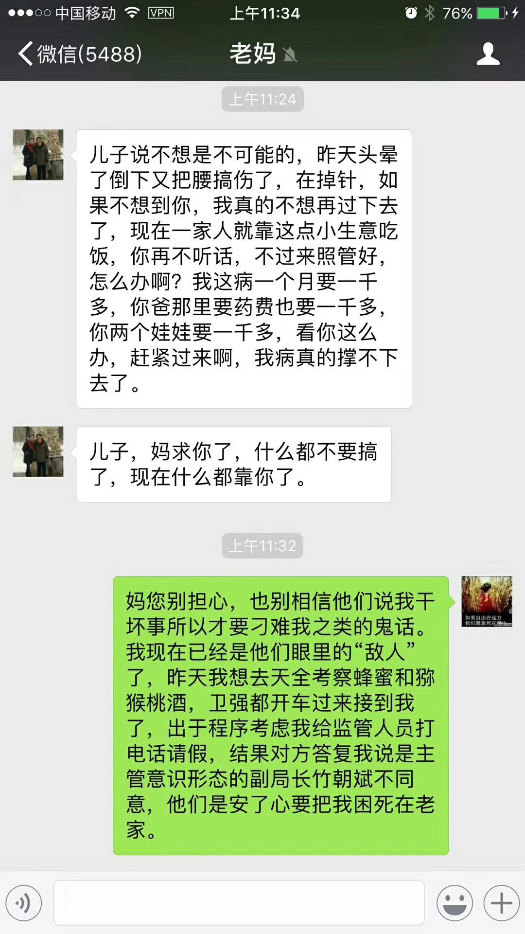 据卫小兵透露,“十一”长假以后,居住在广东陆丰的母亲身体抱恙急需有人照顾。当时卫小兵曾向老家四川芦山县公安局提出请假,要求批准前去陆丰照顾母亲。公安局有关部门答复称“十九大”会议即将召开,建议他等大会结束后再过去广东。与此同时,广东当局出动几十人对其母亲威逼协迫,劝喻老人家要极力劝阻卫小兵,并强令老人写下保证书。见到母亲近似哀求的语气,无奈之下卫小兵只好放弃去广东的计划。目前,“十九大”会议已经结束,迫于生计卫小兵准备去临县商洽农产品货源,打算帮农户销售农产品以便赚取点生活费。但这个想法马上遭到国保队长的反对,对方给出的理由是“主管意识形态的竹姓副局长不同意(他离开芦山县)”。